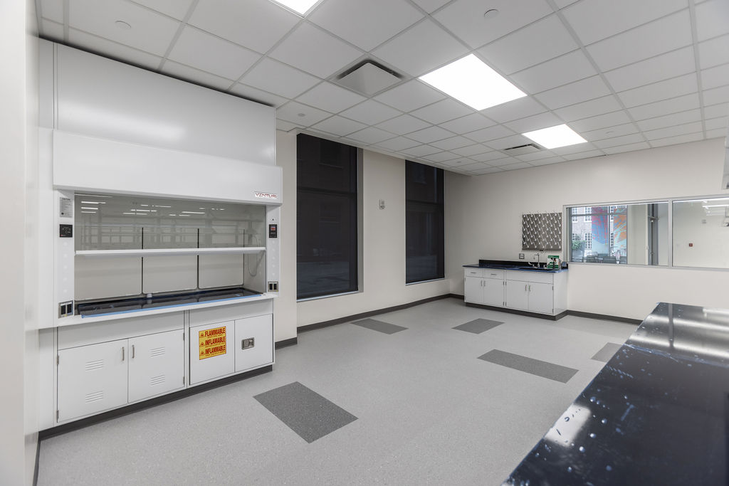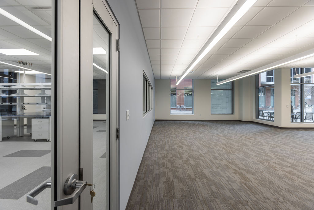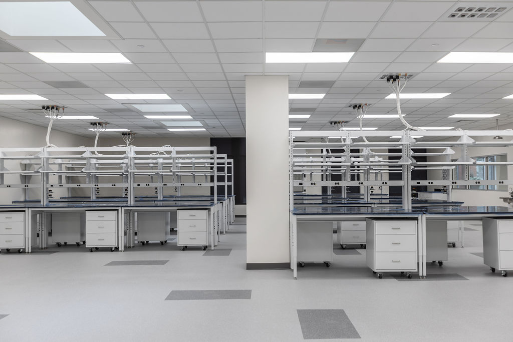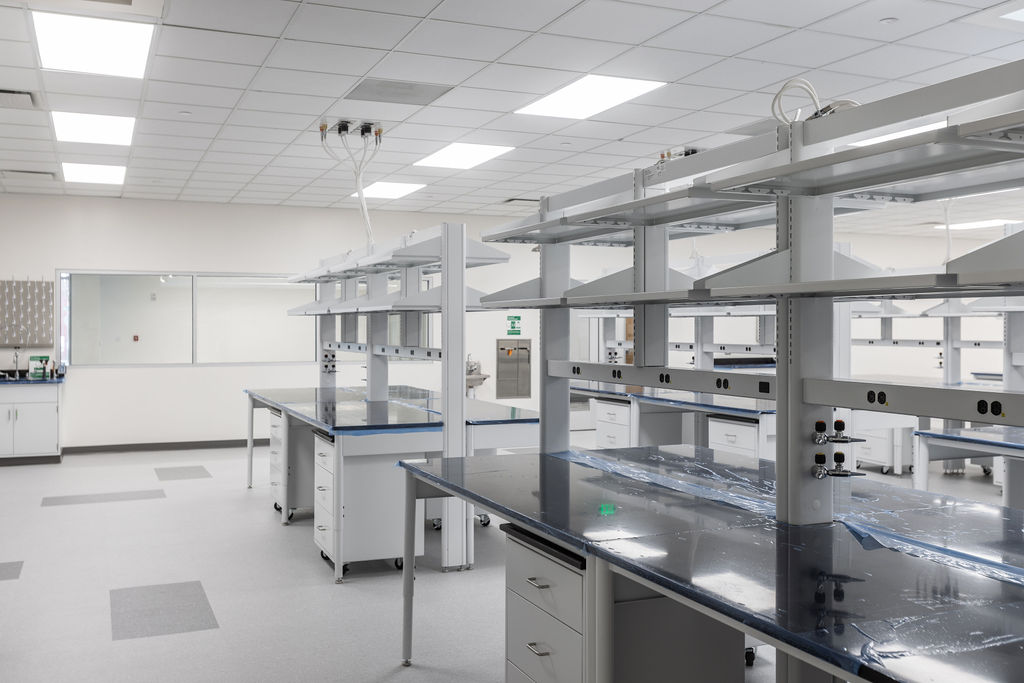 This project transformed a 1st floor cold dark shell into a flexible modern lab and office environment featuring flex zones, open workspace, closed offices, an open lab area with supporting back-of-house functions, conference and huddle rooms, and a break room.